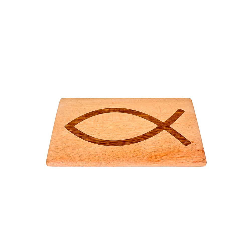 Dieses Brettchen aus heller Buche ist mit einem fein eingesetzten Ichthys-Inlay aus Eiche gestaltet – einem traditionellen Symbol für Glaube, Zuversicht und Zugehörigkeit.